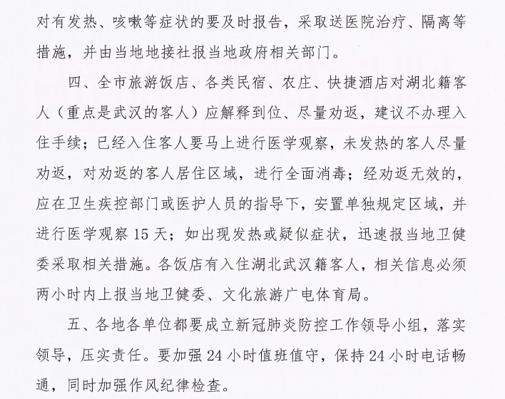四、全市旅游饭店、各类民宿、农庄、快捷酒店对湖北籍客人(重点是武汉的客人)应解释到位、尽量劝返,建议不办理入住手续;已经入住客人要马上进行医学观察,未发热的客人尽量劝返,对劝返的客人居住区域,进行全面消毒;经劝返无效的,应在卫生疾控部门或医护人员的指导下,安置单独规定区域,并进行医学观察15天;如出现发热或疑似症状,迅速报当地卫健委采取相关措施。各饭店有入住湖北武汉籍客人,相关信息必须两小时内上报当地卫健委、文化旅游广电体育局。