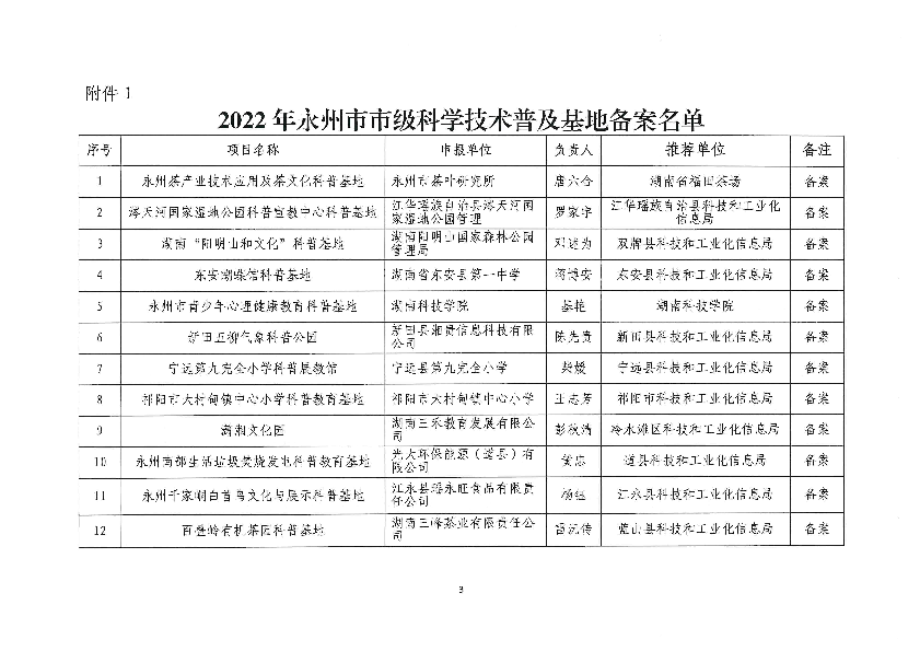 关于发布2022年度永州市市级科学技术普及基地备案及培育名单的通知