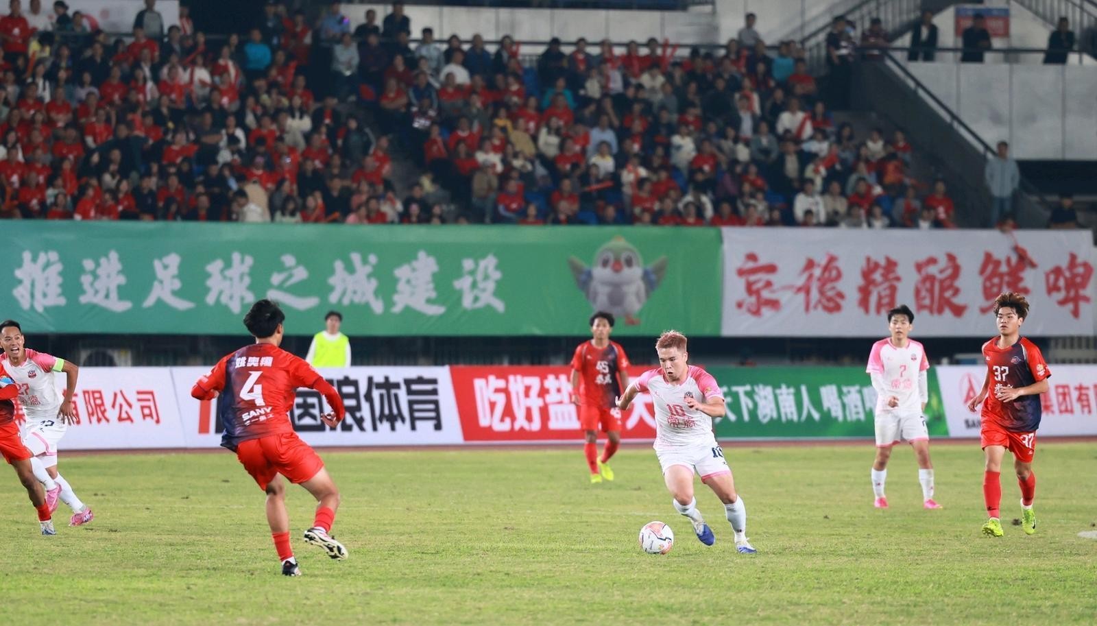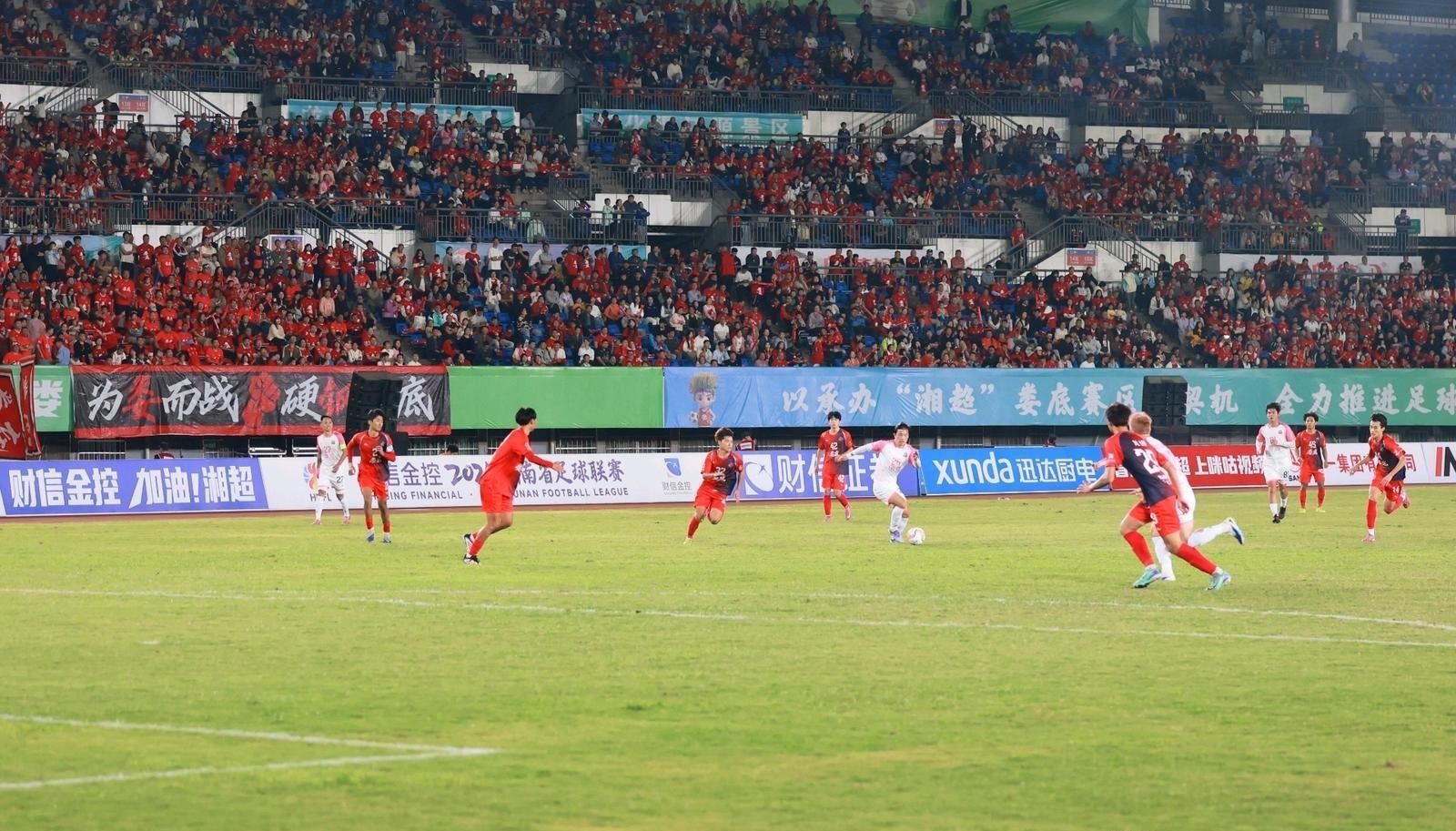 9月20日晚,“湘超”常德队客场对阵主队娄底队,21687名球迷现场为两队摇旗助威。依靠26号球员夏宇航的进球,常德队1:0击败对手,取得两连胜。