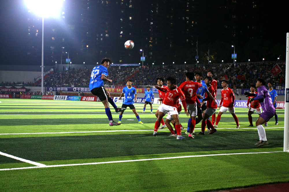 永州市体育场座无虚席,气氛爆棚。19时38分,当值主裁一声哨响,比赛正式拉开帷幕。开场后,双方球员迅速进入状态,展现出极强的进攻侵略性,双方凭借犀利的边路突破,多次创造出极具威胁的进攻机会。比赛进行到第33分钟,永州队开出角球,经过头球摆渡,10号球员赵奥鑫破门,赢得现场球迷阵阵欢呼。半场结束前,永州队创造多次角球,未能破门,带着1:0的比分进入中场休息。