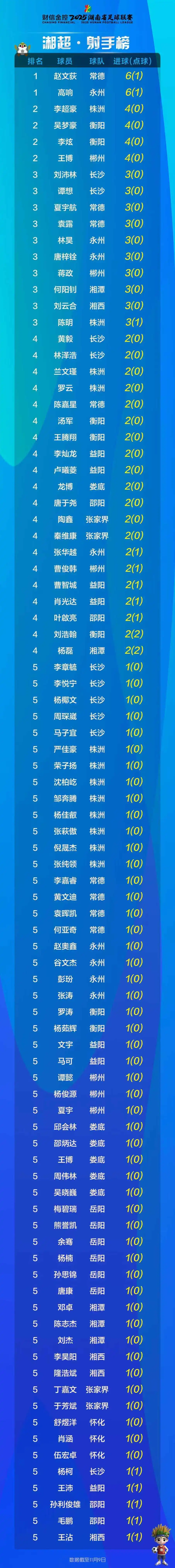 射手榜上,常德队赵文荻和永州队高响目前同以6个进球位居榜首。