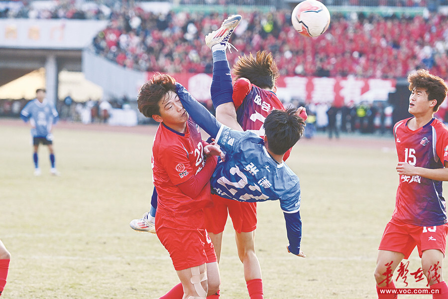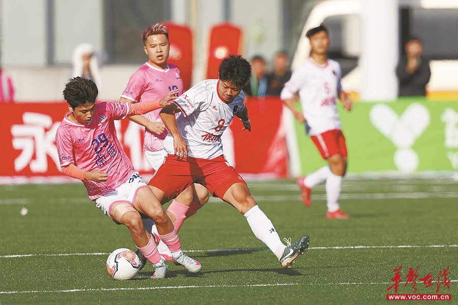 ​12月14日晚,长沙贺龙体育场,球员在比赛中激烈拼抢。当天,2025湘超联赛淘汰赛首轮战火燃爆!长沙队(红)主场迎战岳阳队,最终以2比0战胜岳阳队,与常德、永州、株洲三支球队携手挺进四强。本组照片为华声在线全媒体记者郭立亮及通讯员摄