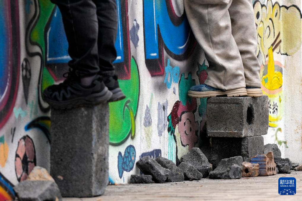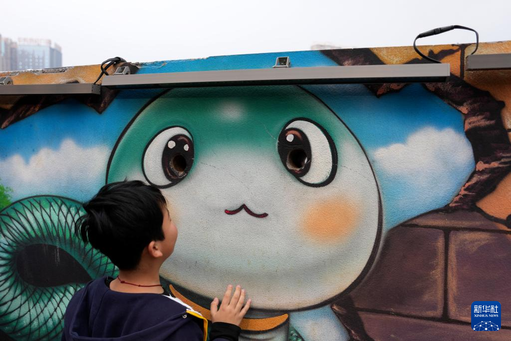 1月18日,观众在永州市体育场外的墙绘前合影留念。