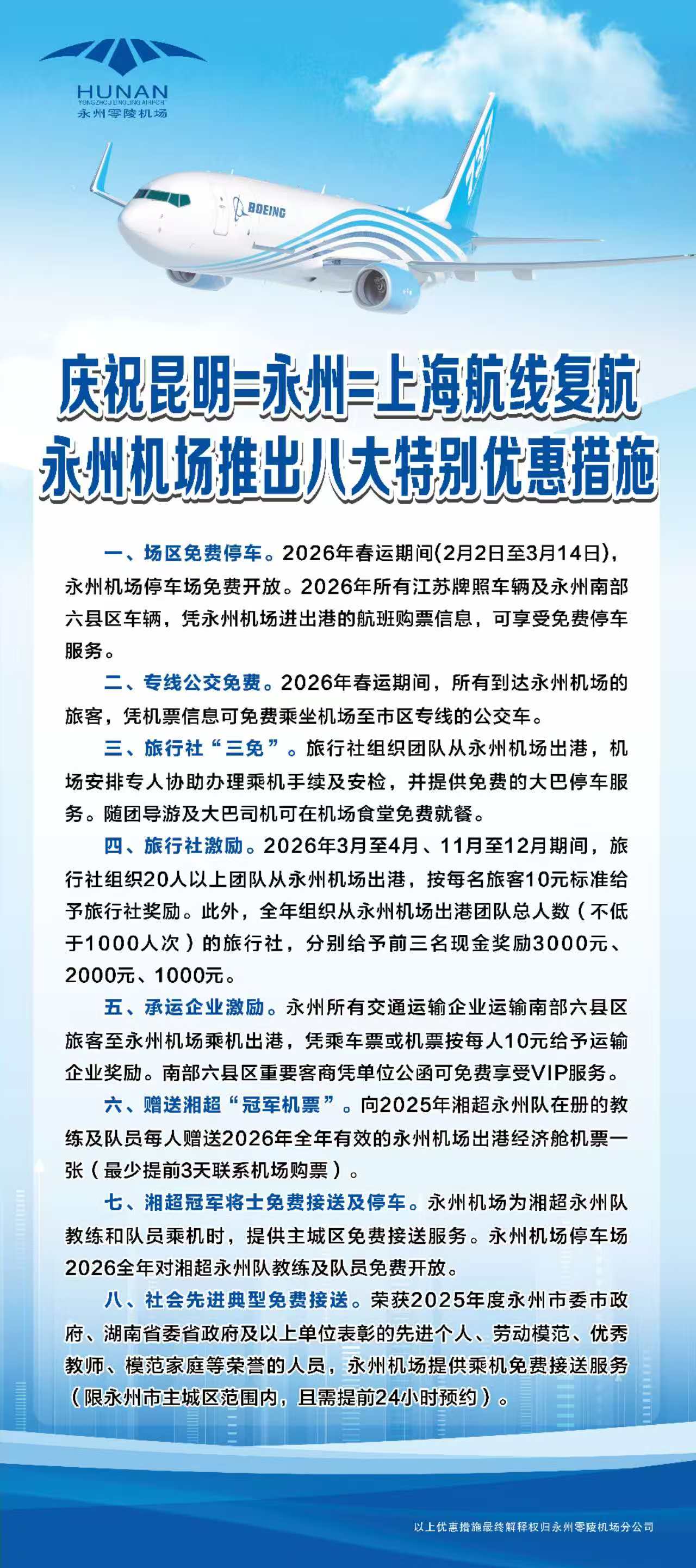 “昆明-永州-上海”航线正式恢复运行,这是市委、市政府主动对接长三角和西部地区,加快建设区域性综合交通枢纽城市的重要部署,既是永州航空事业发展的大事,更是便利群众出行、推动文旅融合、深化区域合作的民生实事,为三地人员往来搭建起高效便捷的“空中走廊”。