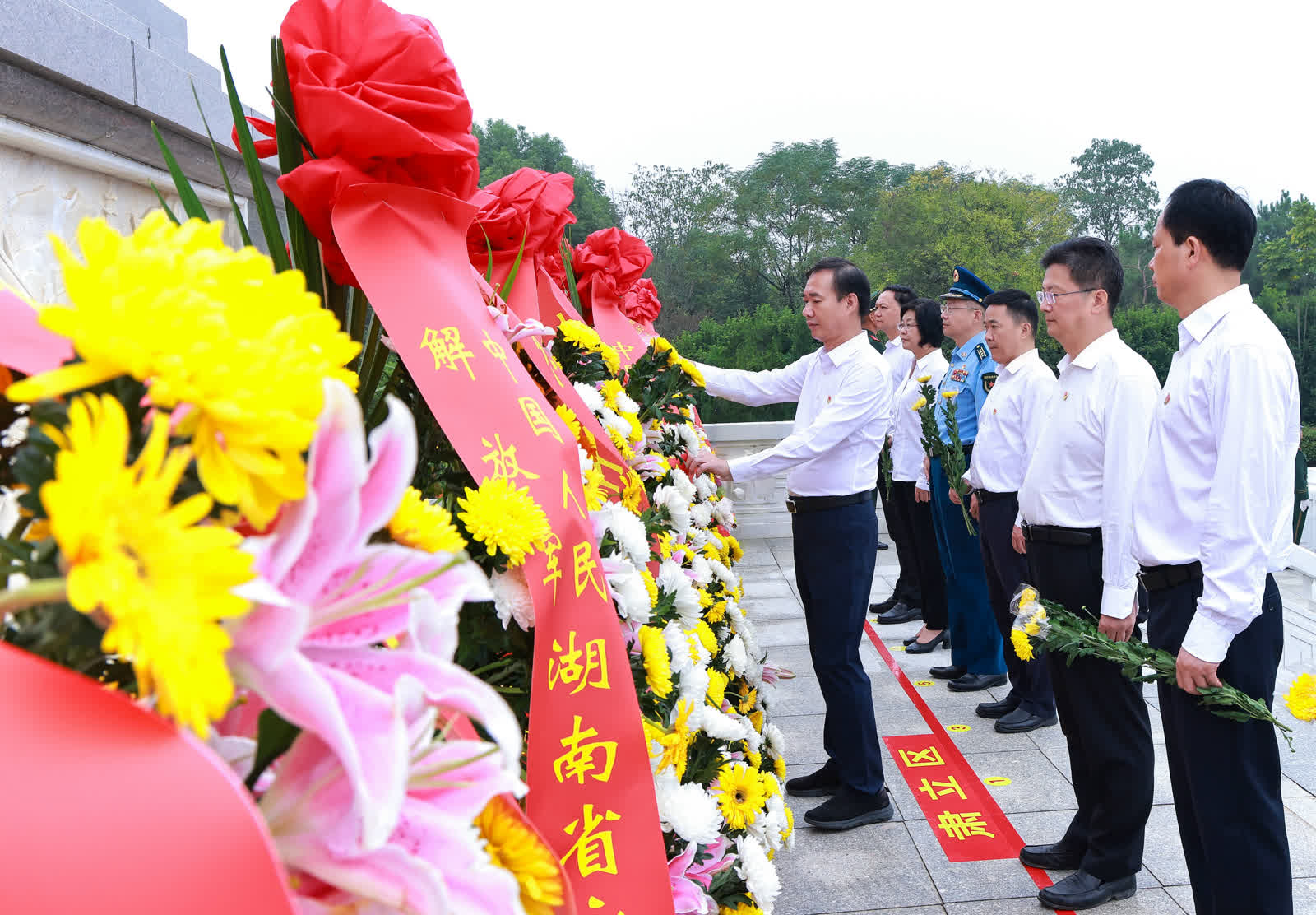 朱洪武缓步走到花篮前,仔细整理缎带。随后,市领导和各界代表依次走到纪念碑前,瞻仰纪念碑并敬献鲜花,缓步绕行一周,追思和学习为民族独立、人民解放和国家富强、人民幸福而英勇牺牲的革命先烈的崇高精神,从中汲取砥砺奋进的精神力量,从而更加深刻领悟“两个确立”的决定性意义,增强“四个意识”、坚定“四个自信”、做到“两个维护”,为奋力谱写中国式现代化湖南篇章作出永州更大贡献。