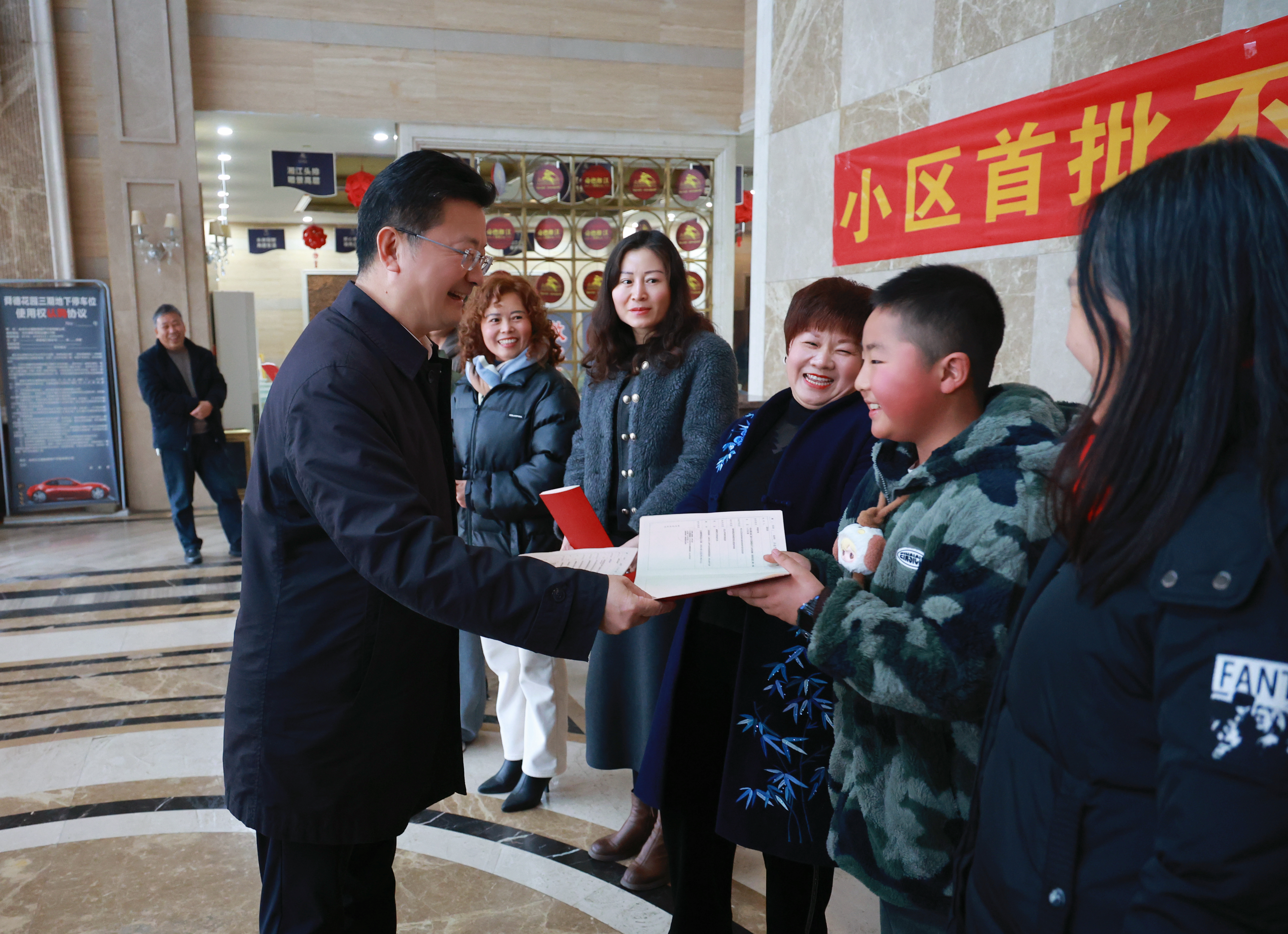 今日永州讯(全媒体记者 谢档 雷靖)2月12日下午,市委副书记、市长陈爱林为冷水滩区舜德湘江小区业主代表颁发不动产权证书。市委常委、副市长陈卓懿,市政府秘书长齐爱社参加。