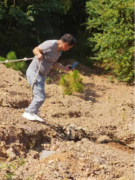 天堂管理所负责人李永秋拉结绳到边坡下方查明情况