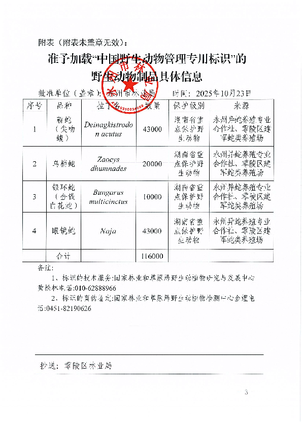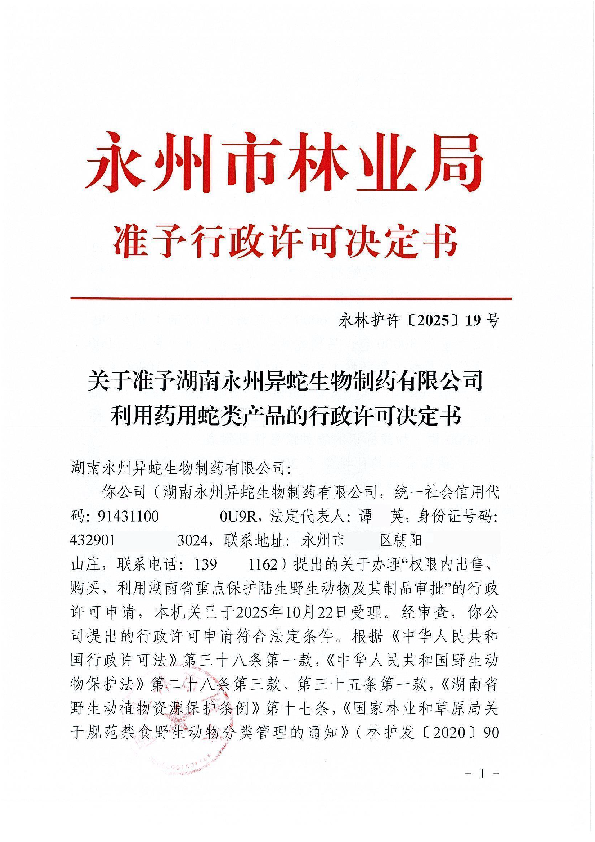 永林护许〔2025】19号关于准予湖南永州异蛇生物制药有限公司利用药用蛇类产品的行政许可决定书