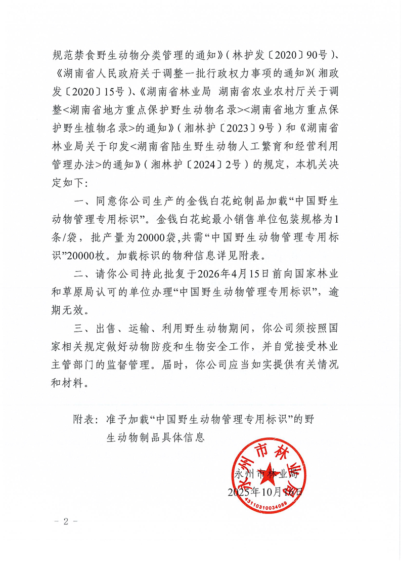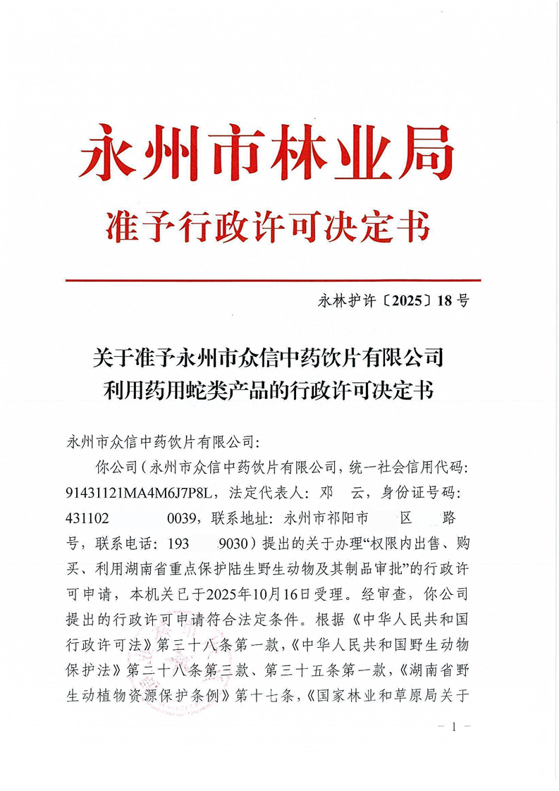 永林护许【2015】18号关于准予永州市众信中药饮片有限公司利用药用蛇类产品的行政许可决定书