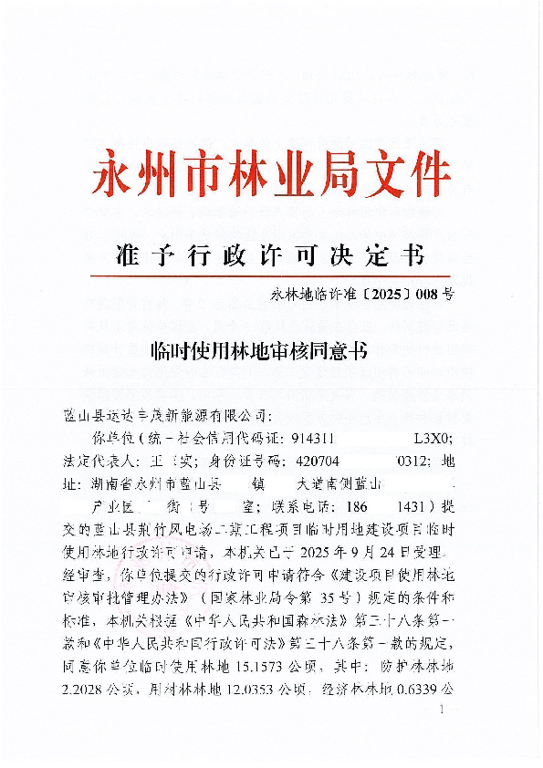 永林地临许准〔2025〕008号(蓝山县荆竹二期风电场临时使用林地)