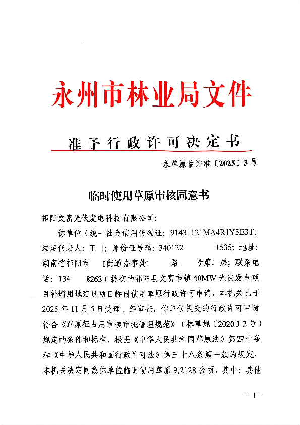 永草原临许准〔2025〕3号临时使用草原审核同意书