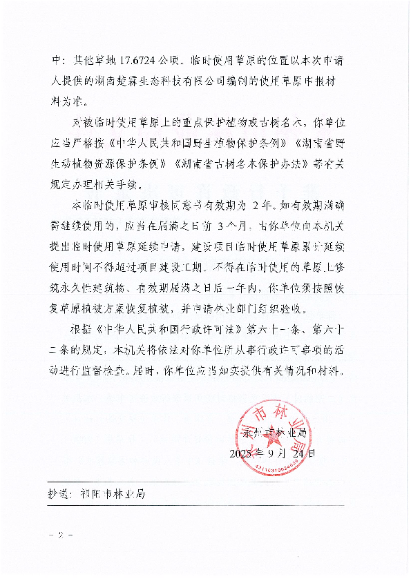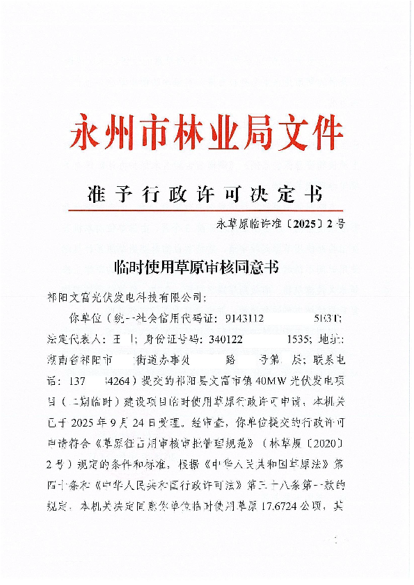 永草原临许准〔2025〕2号临时使用草原审核同意书(祁阳县文富市镇40MW光伏发电项目)