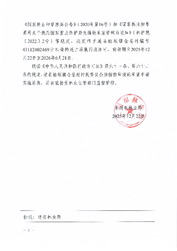 永林护许(2025】21号关于准予道县蚣坝镇金星村编号43112402469古木荷的死亡采集行政许可决定书