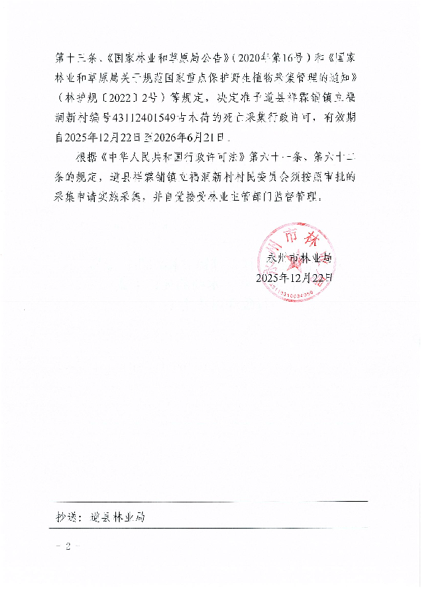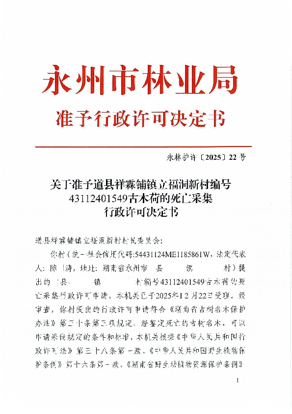 永林护许〔2025】22号关于准予道县祥霖铺镇立福洞新村编号43112401549古木荷的死亡采集行政许可决定书