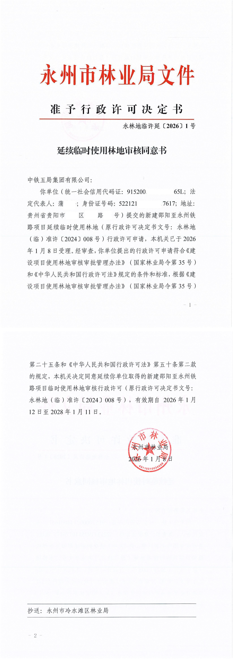 永林地临许延[2026]1号延续使用林地审核同意书