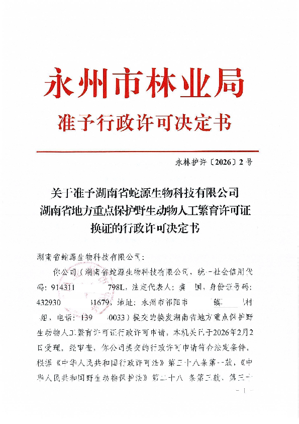 永林护许〔2026〕2号关于准予湖南省蛇源生物科技有限公司湖南省地方重点保护野生动物人工繁育许可证换证的行政许可决定书