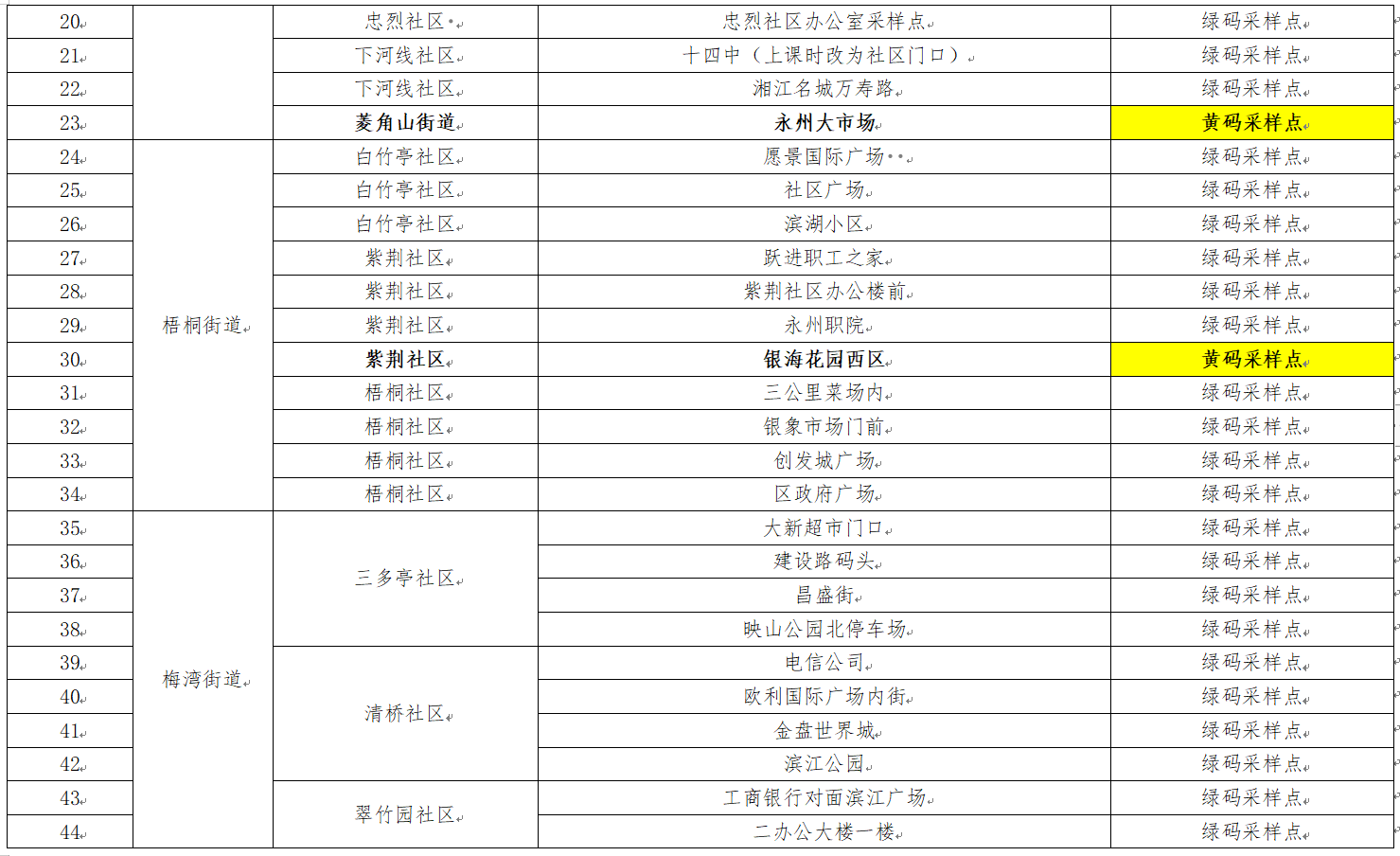 凤凰街道、梧桐街道、珊瑚街道(城区)、杨家桥街道、菱角山街道、曲河街道、梅湾街道、肖家园街道、永州市经开区仁湾街道(采样点详见附表)。