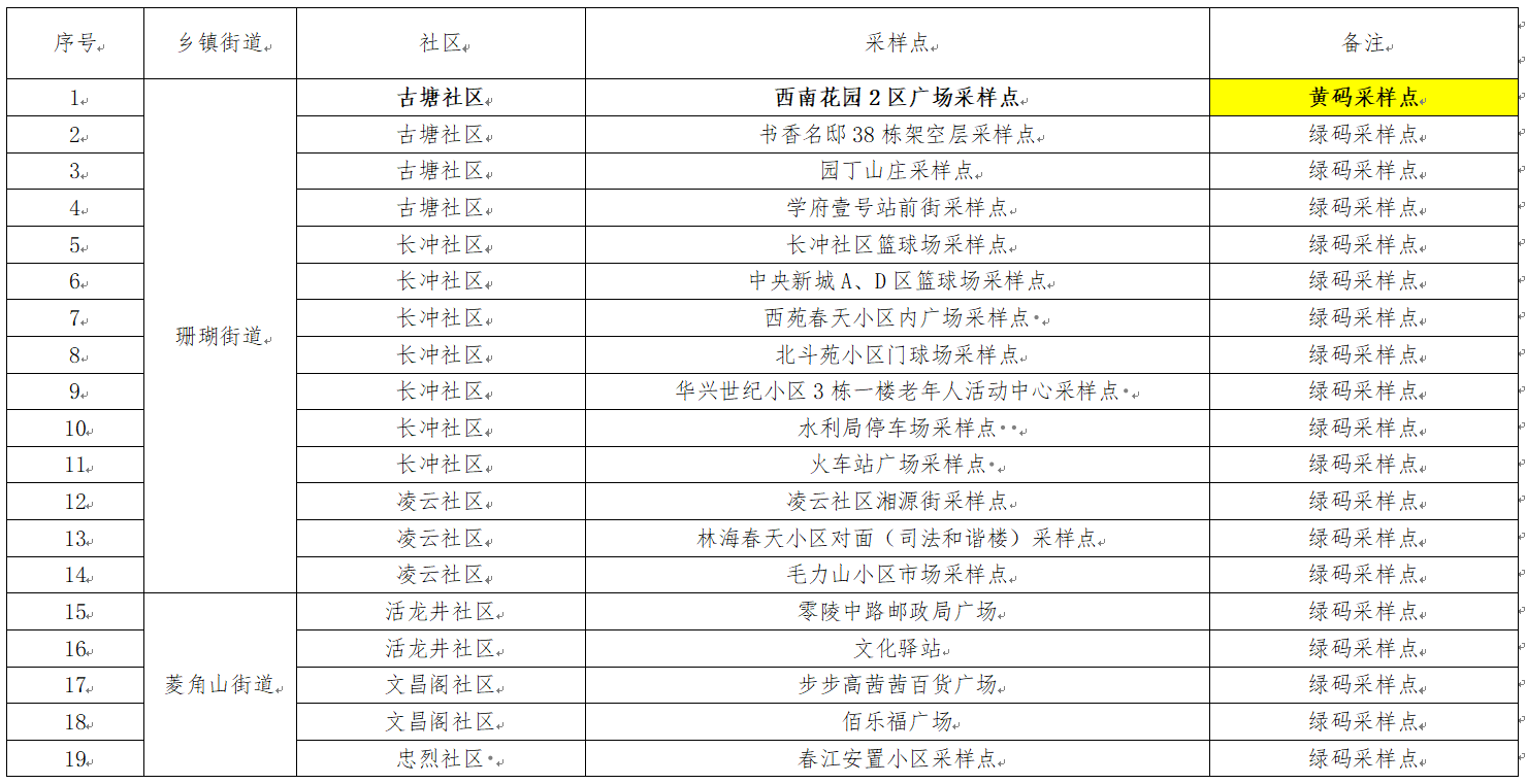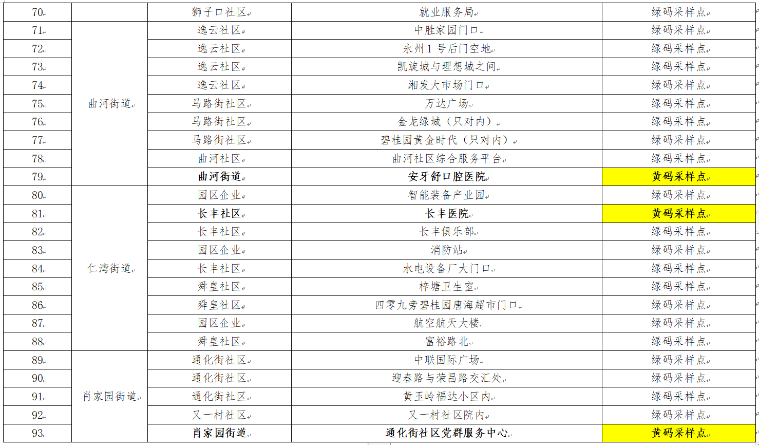主城区核酸检测筛查采样点安排表