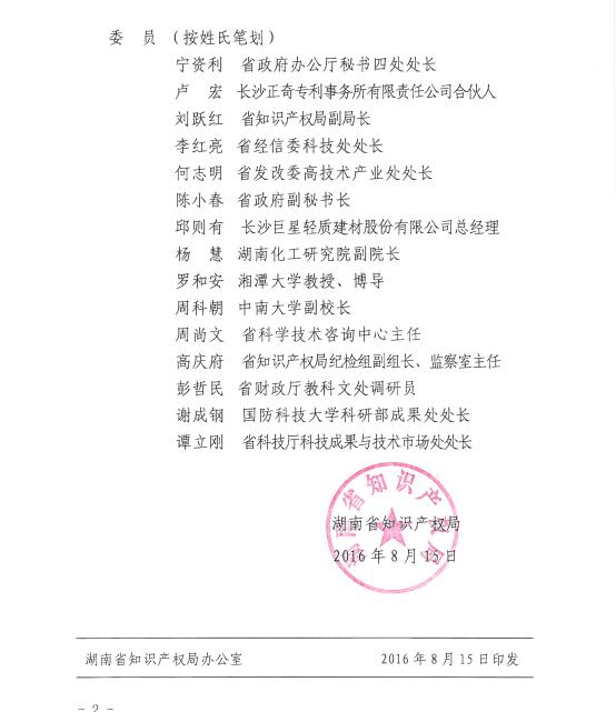 湘知发〔2016〕55 号湖南省知识产权局关于调整湖南省专利奖奖励委员会组成人员的通知
