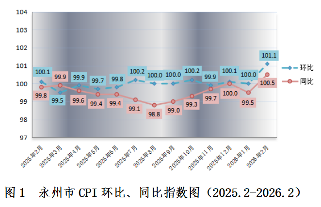 1.春节消费提振叠加供应阶段性收紧,猪肉价格上涨。2月份,猪肉价格环比上涨9.1%,影响CPI上涨约0.22个百分点。一是春节假期提振终端消费需求。永州春节返乡、团圆宴、腌腊备货需求集中释放,家庭采购与餐饮、宴席备货叠加,猪肉刚需激增。二是供应阶段性收紧。节前养殖户集中出栏,春节期间屠宰场停工、养殖户惜售压栏,市场流通猪源减少,加之本地生猪出栏节奏放缓,供应偏紧。三是市场短期错配。永州猪肉依赖本地与外地调运,节日流通效率下降,供需短期失衡,叠加节日消费对价格敏感度低,推动涨价。