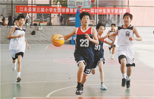 9月26日,江永县各乡镇中学代表队参加全县第21届初中生男子篮球赛。新学期以来,该县中小学切实落实每天两小时体育锻炼活动,学生在校园内积极开展排球、篮球、足球等训练和比赛,强健体魄。 田如瑞 摄