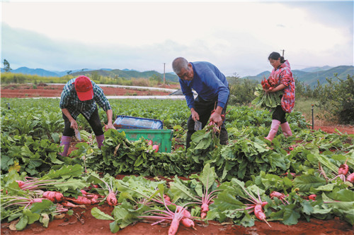 9月22日,新田县骥村镇李家山村,村民在采收红皮萝卜,销往粤港澳大湾区蔬菜市场。近年来,新田县以土地富硒资源优势为依托,积极对接粤港澳大湾区“菜篮子”工程,以“公司+基地+农户”的模式,大力发展订单特色蔬菜产业,保障粤港澳大湾区蔬菜市场供给,增加农民收入。 刘贵雄 摄