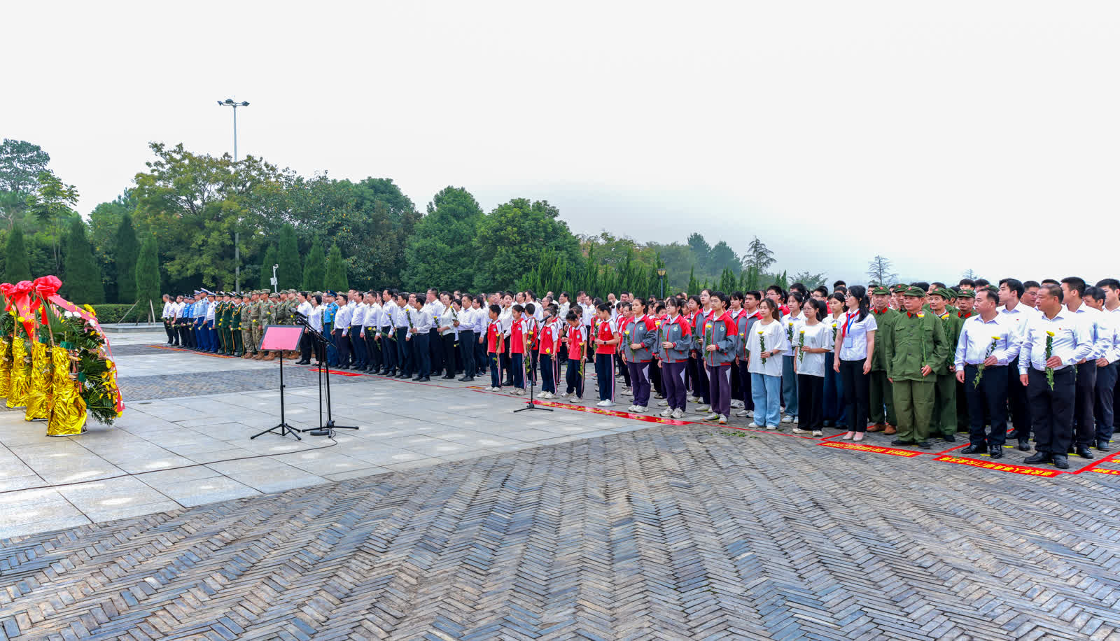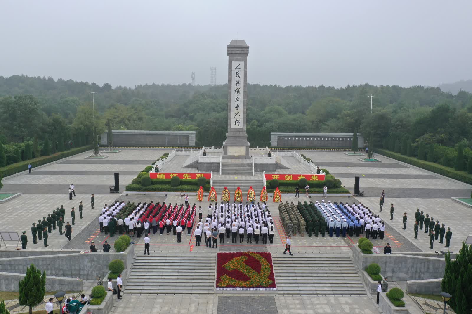 秋风寄哀思,鲜花献英烈。烈士纪念碑巍然耸立,现场静穆庄严。8时许,仪式正式开始。伴随雄壮激昂的旋律,全场齐声高唱中华人民共和国国歌。国歌唱毕,全场肃立,向烈士默哀。随后,手持鲜花的少先队员高唱《我们是共产主义接班人》,向烈士致敬。