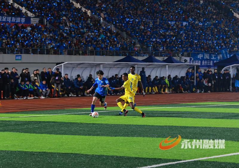 湘超赞助商代表、“央超”球员代表、外地球迷代表、海内外永州人也向晚会发来拜年视频。与永州有经贸合作关系的非洲国家友人带来奔放热烈的鼓舞节目《燃情非洲》,展示了质朴的热情与力量。随后,永州健儿与非洲友人展开了一场精彩的永非经贸交流足球友谊赛。非洲足球队员来自几内亚、多哥、尼日利亚等19个国家,包括7名参加过非洲国家杯(AFCON)及非洲国家锦标赛(CHAN)的国脚。经过激烈角逐,永州队在最后一刻追平比分,双方2比2战平。球赛结束后,晚会在温馨的《相亲相爱一家人》全场互动歌舞中落下帷幕。