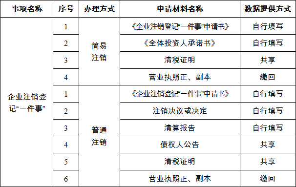 ①简易注销:未发生债权债务或已将债权债务清偿完结的市场主体(上市股份有限公司除外)。市场主体在申请简易注销登记时,未发生或者已结清清偿费用、职工工资、社会保险费用、法定补偿金、应缴纳税款(滞纳金、罚款),且不存在以下情形的,适用简易注销程序:1.涉及国家规定实施准入特别管理措施的外商投资企业;2.在经营异常名录或者市场监督管理严重违法失信名单中的;3.存在股权(财产份额)被冻结、出质或者动产抵押,或者对其他市场主体存在投资的;4.正在被立案调查或者采取行政强制措施,正在诉讼或者仲裁程序中的;5.被吊销营业执照、责令关闭、撤销的;6.受到罚款等行政处罚尚未执行完毕的;7.企业所属的非法人分支机构未办理注销登记的;8.法律、行政法规或者国务院决定规定在注销登记前需经批准的;9.不适用简易注销登记的其他情形。人民法院裁定强制清算或裁定宣告破产的,有关企业清算组、企业管理人可持人民法院终结强制清算程序的裁定或终结破产程序的裁定,向被强制清算人或破产人的原登记机关申请办理简易注销登记。由全体投资人书面承诺对上述情况的真实性承担法律责任。简易注销公示期为20日,在公示期内无相关部门、债权人及其他利害关系人提出异议的,市场主体可以于公示期届满之日起20日内向登记机关申请注销登记。企业在公示后,不得从事与注销无关的生产经营活动。