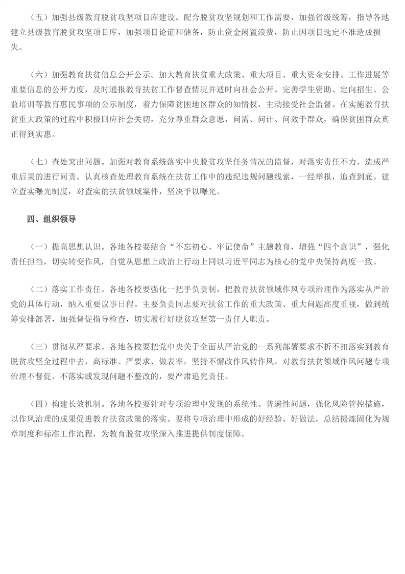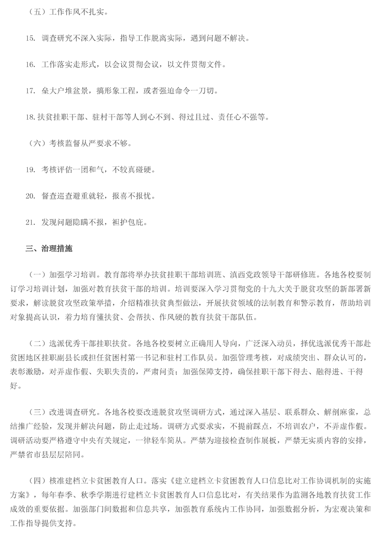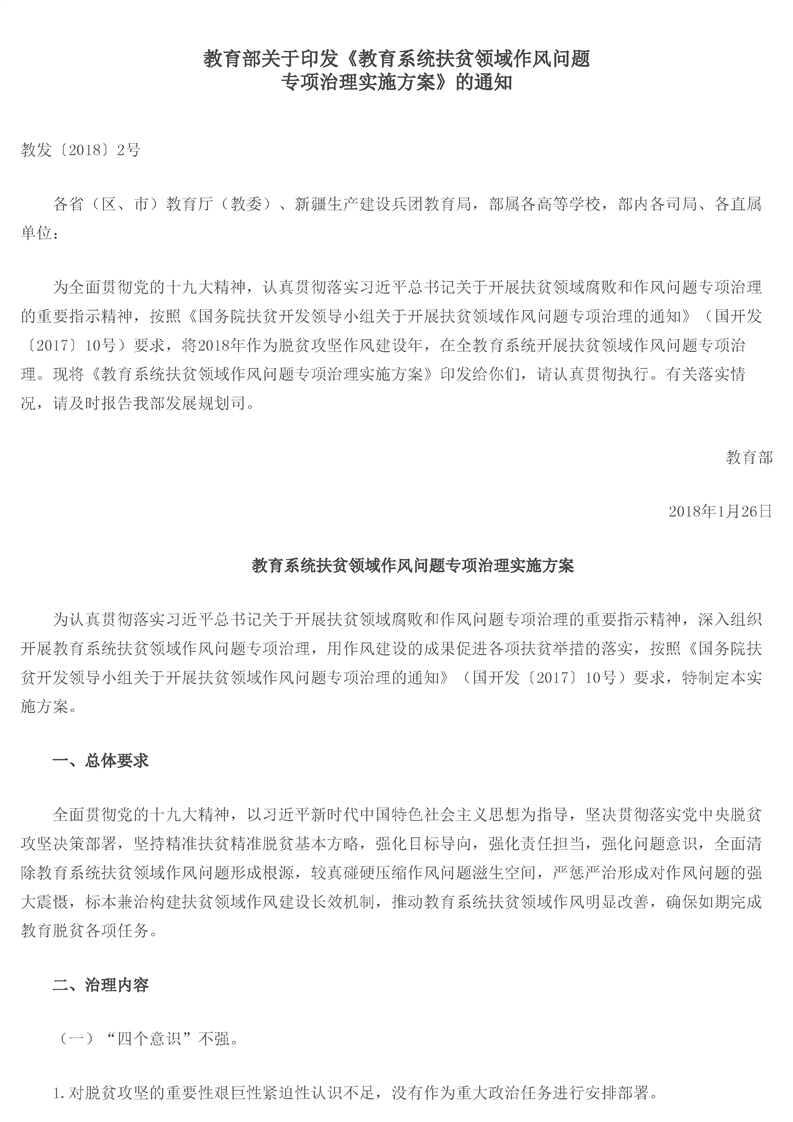 教育部关于印发《教育系统扶贫领域作风问题专项治理实施方案》的通知