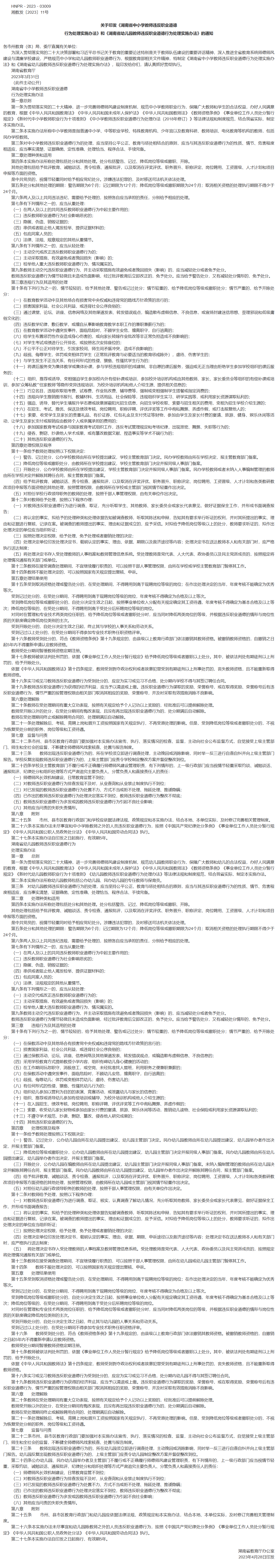 关于印发《湖南省中小学教师违反职业道德行为处理实施办法》和《湖南省幼儿园教师违反职业道德行为处理实施办法》的通知