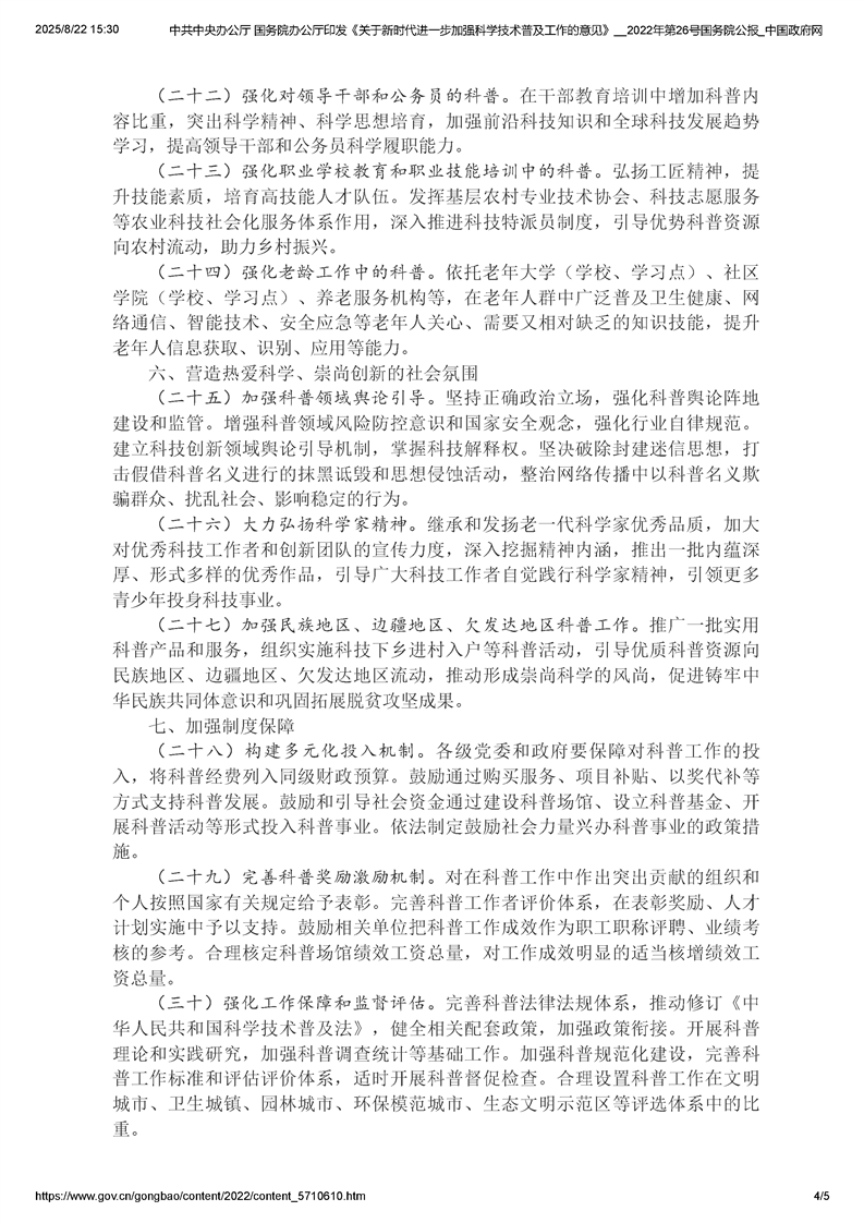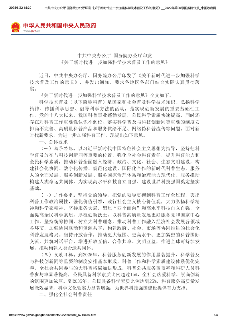 中共中央办公厅 国务院办公厅印发《关于新时代进一步加强科学技术普及工作的意见》