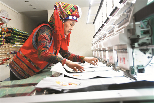 3月24日,江永县云上瑶绣文化发展有限公司生产车间内,员工使用数控绣花机生产刺绣产品。近年来,该县加大对刺绣产业的扶持力度,引进智能绣花机设备,推动刺绣产业数字化、智能化转型发展。 田如瑞 摄