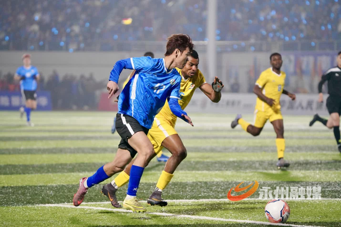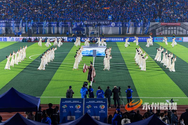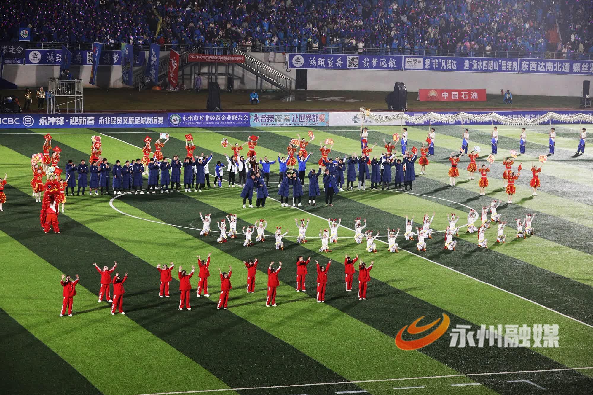 湘超赞助商代表、“央超”球员代表、外地球迷代表、海内外永州人也向晚会发来拜年视频。与永州有经贸合作关系的非洲国家友人带来奔放热烈的鼓舞节目《燃情非洲》,展示了质朴的热情与力量。随后,永州健儿与非洲友人展开了一场精彩的永非经贸交流足球友谊赛。非洲足球队员来自几内亚、多哥、尼日利亚等19个国家,包括7名参加过非洲国家杯(AFCON)及非洲国家锦标赛(CHAN)的国脚。经过激烈角逐,永州队在最后一刻追平比分,双方2比2战平。球赛结束后,晚会在温馨的《相亲相爱一家人》全场互动歌舞中落下帷幕。