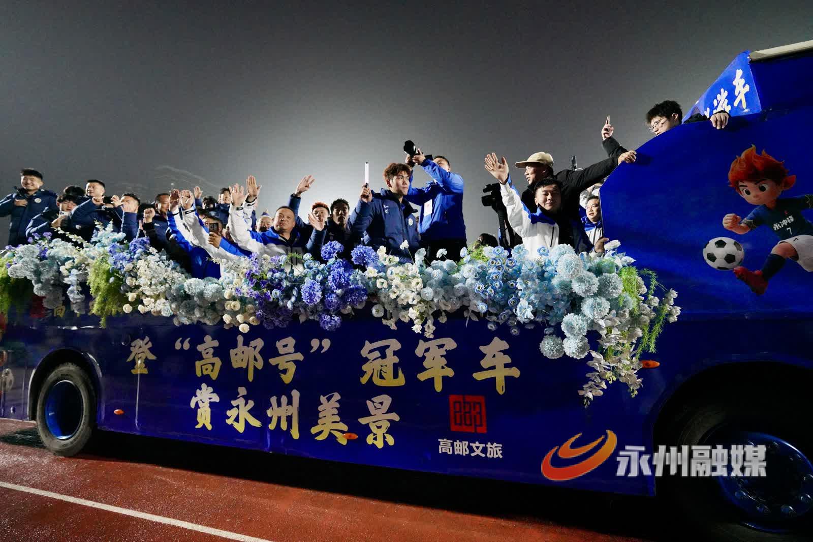 为了答谢全市人民和所有关心支持湘超永州队的朋友,永州市委、市政府精心组织了这台“足球春晚”。18时40分,湘超冠军永州队队员与感动全网的“第12人”代表、全市各县市区代表、江苏“十三太保”代表,和退伍军人、外来务工人员、劳模代表一起,乘坐冠军巡游花车驶入体育场,现场掌声呐喊声雷动,全场近2万人合唱《真心英雄》,拉开了“足球春晚”帷幕。