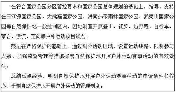 1.推动自然资源向户外运动开放。围绕可利用的森林、草原、沙漠、湖泊、海滩海域等自然资源,在符合自然保护地、生态保护红线相关法律法规、管控要求和项目准入制度的前提下,在部分有条件的国家公园、自然保护区、自然公园等自然保护地划定合理区域开展自然资源向户外运动开放试点,建立健全自然保护地开展户外运动的监管制度。