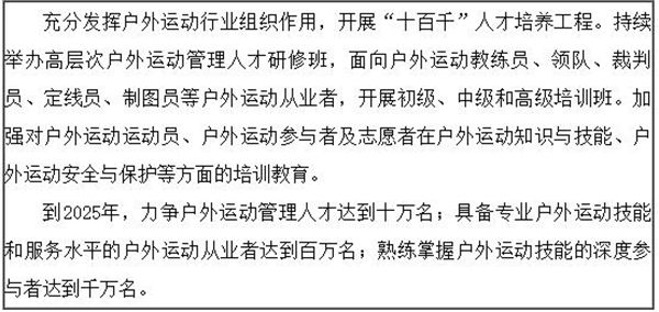 17.推进户外运动人才培养。鼓励普通高等学校、职业院校开设户外运动产业相关课程,创新户外运动产业人才培养模式,推动产业发展需求侧与学校人才培养供给侧紧密对接。鼓励相关企业联合普通高等学校、职业院校、科研院所建立户外运动教学、科研和培训基地,培养户外运动研究型、技能型、应用型人才。加强与国际户外运动行业组织、机构和企业的交流合作,引进高层次人才。鼓励和支持退役运动员从事户外运动产业,扩大专业人才队伍。