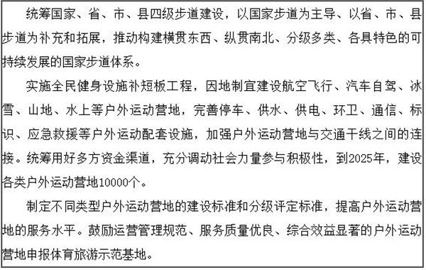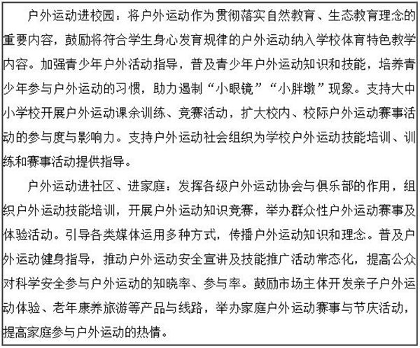 9.推动户外运动与其他行业融合发展。加强户外运动与教育融合,有序发展户外运动教育与培训市场。推进户外运动与旅游深度融合,以徒步、骑行、汽车自驾、航空运动等项目串联景区景点、度假区。推动户外运动与卫生、健康、养老等融合,开展户外运动健康干预、康复疗养、健康养老等多样化康体服务,发展户外运动康复产业。支持户外运动与文化产业融合,开展户外运动电影、纪录片、摄影、动漫、收藏品等创作及展示展览活动,发展户外运动文化产业。推动户外运动与现代农业深度融合,巩固拓展体育扶贫成果同乡村振兴有效衔接,大力发展生态户外运动、绿色户外运动、低碳户外运动。
