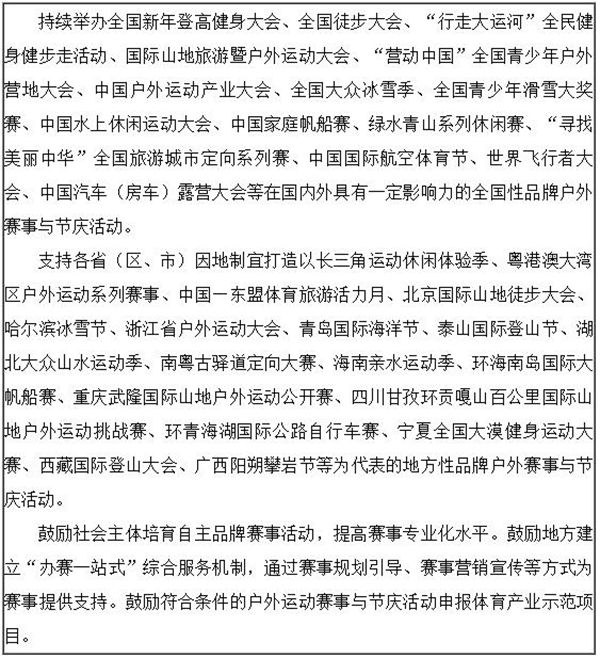 10.提升户外赛事与节庆活动品质。以政府引导、市场主导、全民参与为原则,按照常态化疫情防控要求,组织举办观赏性强的户外运动竞赛表演活动,以及群众喜闻乐见的参与型户外运动赛事活动。鼓励各地结合自然、人文特色资源,培育户外运动赛事与节庆活动。到2025年,打造100个全国知名的户外运动赛事与节庆活动品牌。