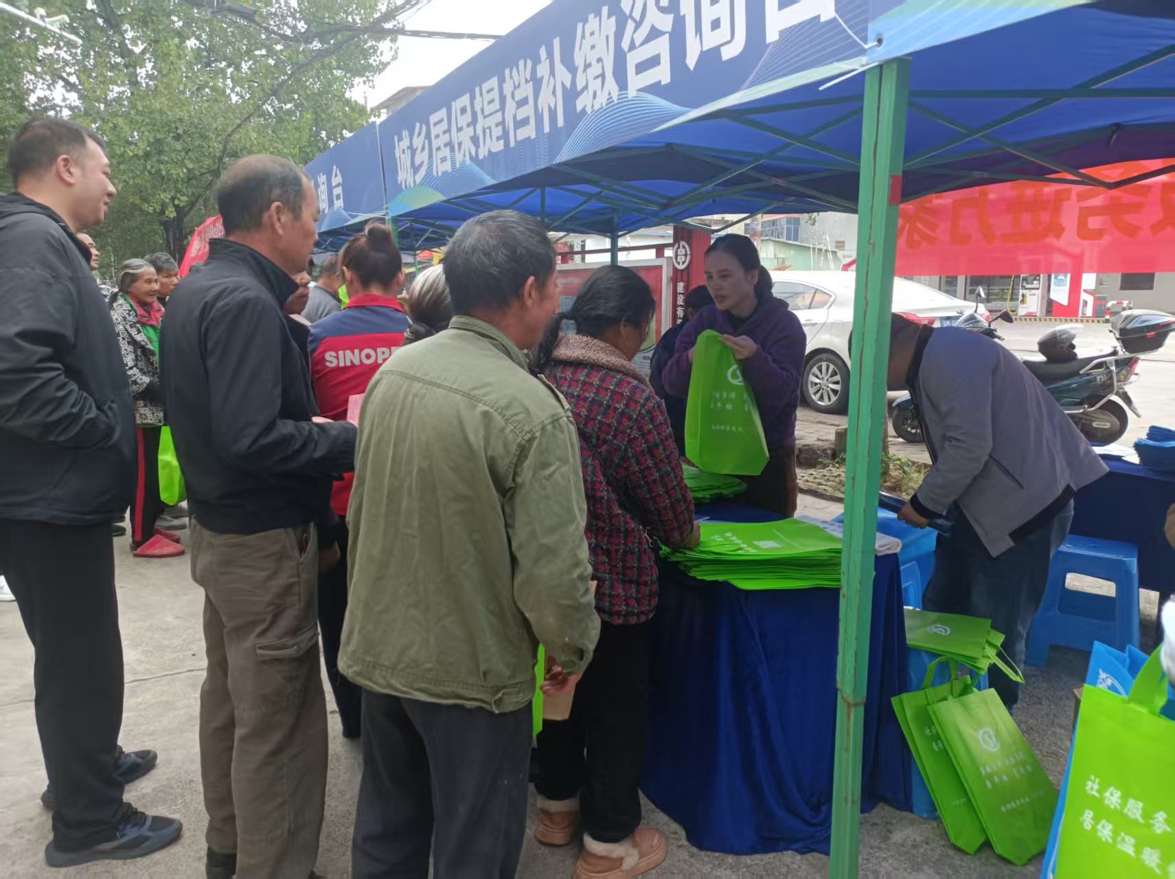 活动当天,上岭桥镇现场人头攒动,气氛热烈。社保工作人员提前布置了宣传展台,整齐摆放着设计精美、内容详实的宣传折页、《政策宣传指南》以及“提档补缴”流程说明材料,活动还配发了实用的宣传物品,吸引了不少群众驻足咨询。