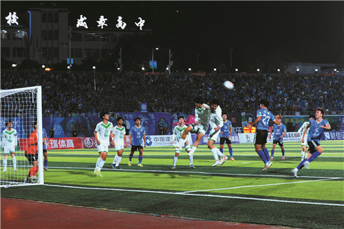 永州市体育场气氛爆棚,16500余名球迷为各自队伍加油鼓劲,球迷助威声响彻整个球场。19时38分,当值主裁一声哨响,比赛正式拉开帷幕。开场后,永州队迅速进入状态,发起猛烈进攻。比赛进行到第11分钟,永州队角球送出高质量传中,47号林昊头球破门,帮助球队1:0取得领先。比赛第18分钟,永州队再次抓住角球机会,46号谷文杰跟进抢点补射得分,永州队2:0领先郴州队。两球落后的郴州队在场上拼抢十分积极,比赛第23分钟,郴州队获得角球机会,郴州队员甩头攻门稍稍偏出。
