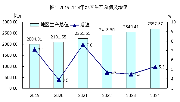 初步测算,全年全市地区生产总值[2]2692.57亿元,比上年增长5.3%。其中,第一产业469.34亿元,增长3.0%,第二产业888.58亿元,增长6.1%,第三产业1334.65亿元,增长5.7%。人均地区生产总值53346元,增长6.6%。