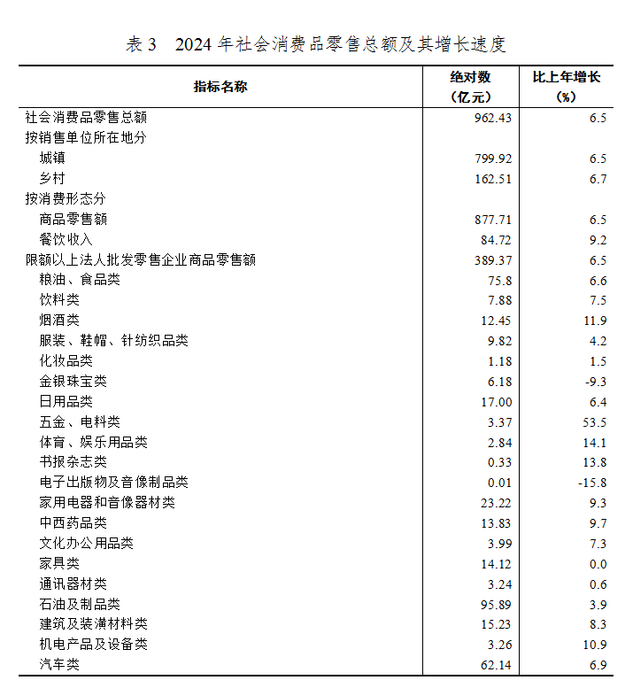 全年社会消费品零售总额[7] 962.43亿元,比上年增长6.5 %。分经营地看,城镇消费品零售总额799.92亿元,增长6.5 %;乡村消费品零售总额162.51亿元,增长6.7 %。
