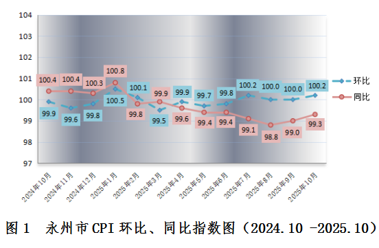 2025年10月份,食品供应总体充足,永州居民消费价格(CPI)同比价格下跌0.7%,环比价格上涨0.2%。