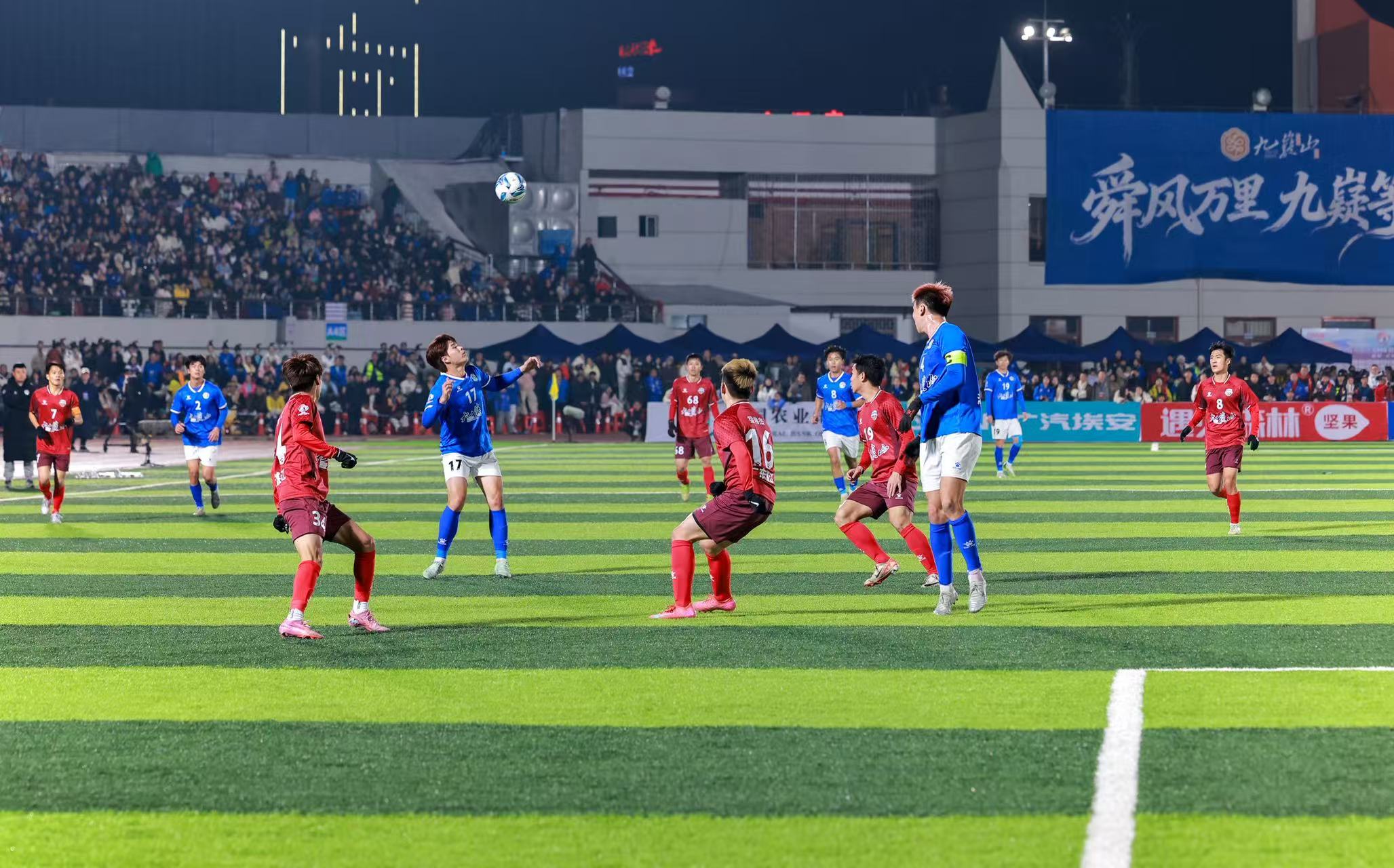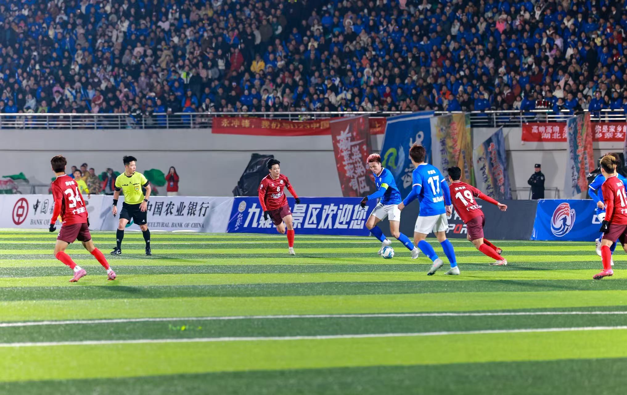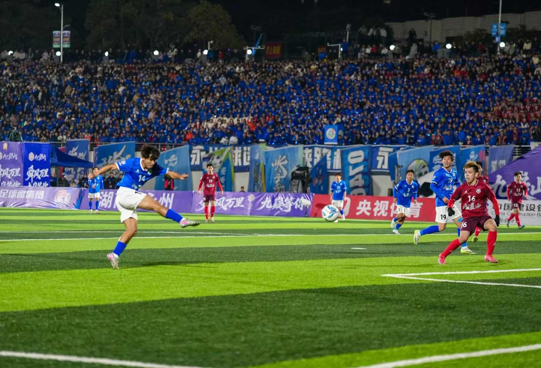 19时35分,决赛正式开始,永州体育场座无虚席、气氛热烈,16020名球迷到场观赛。决赛从一开始便进入高节奏对抗,主场作战的永州队试图抢占先机,但湛江队凭借娴熟技术与流畅配合始终掌控场上节奏。比赛第37分钟,湛江队6号陶智略抓住机会门前推射破门,湛江队1:0领先永州队。仅两分钟后,湛江队禁区外远射造成门将脱手,陶智略机敏补射梅开二度,将比分扩大为2:0。