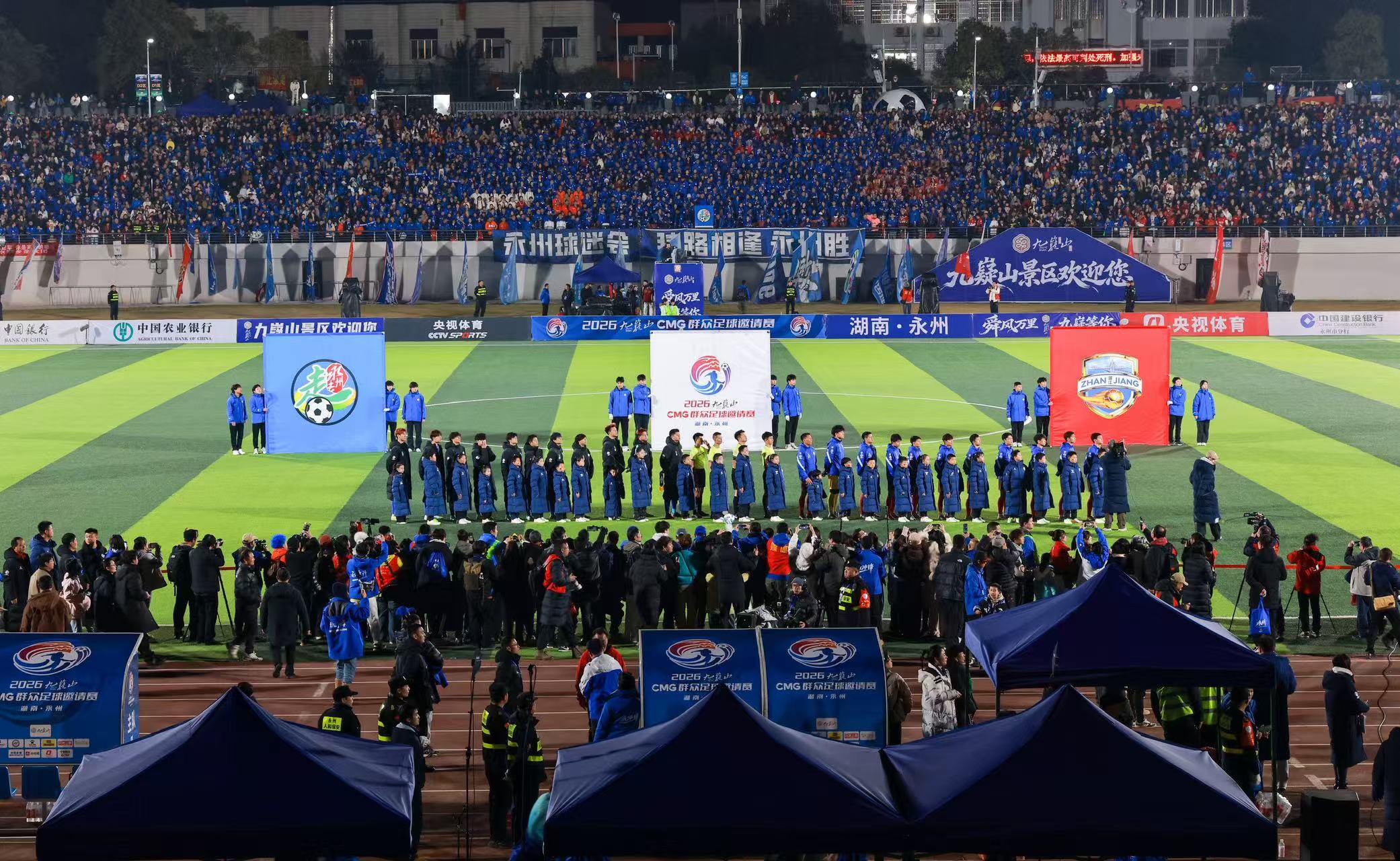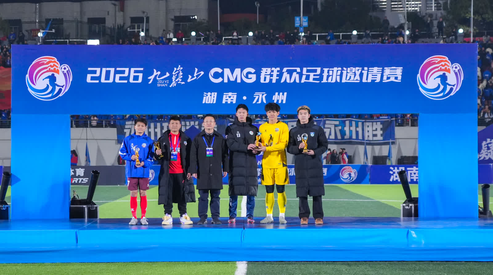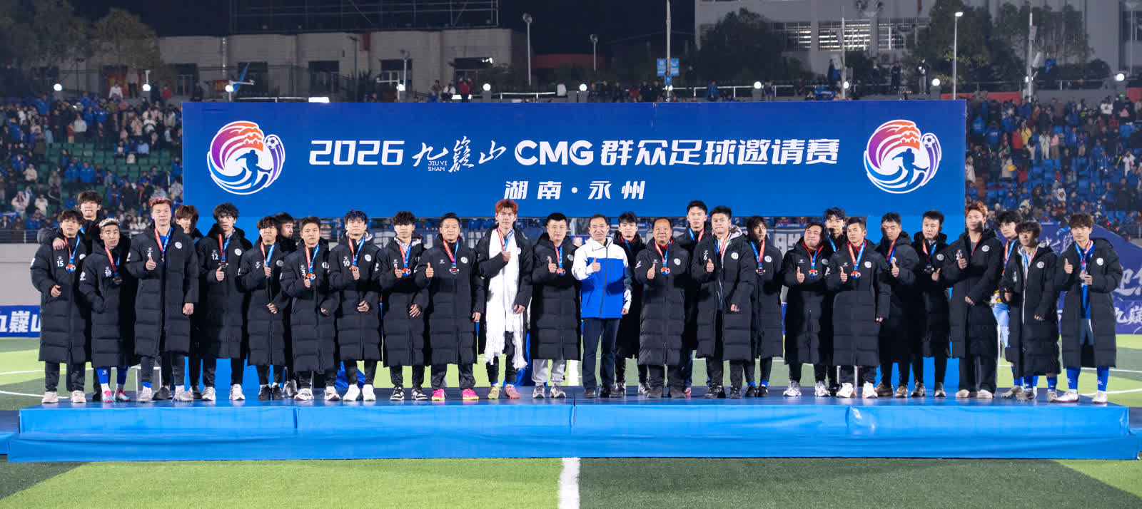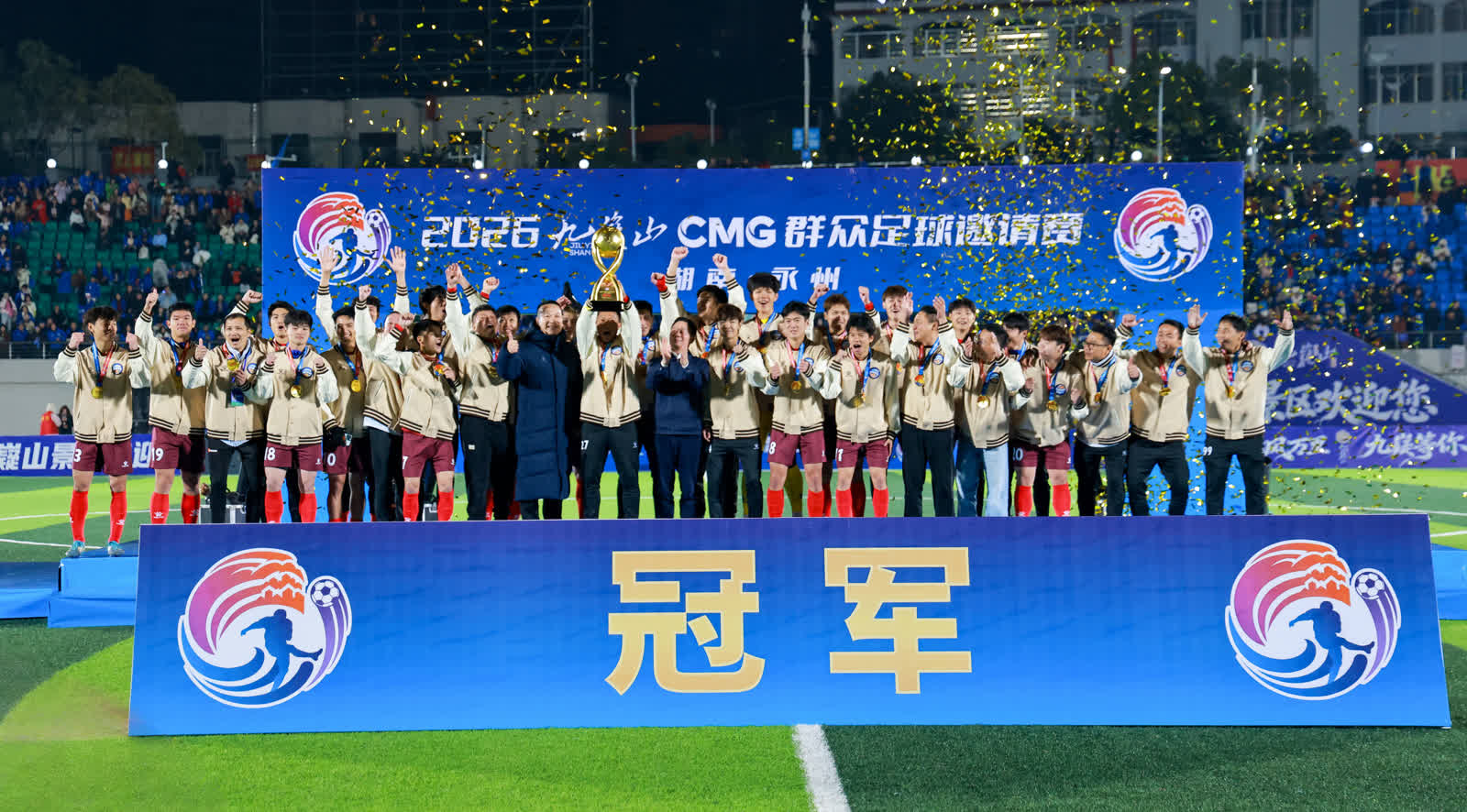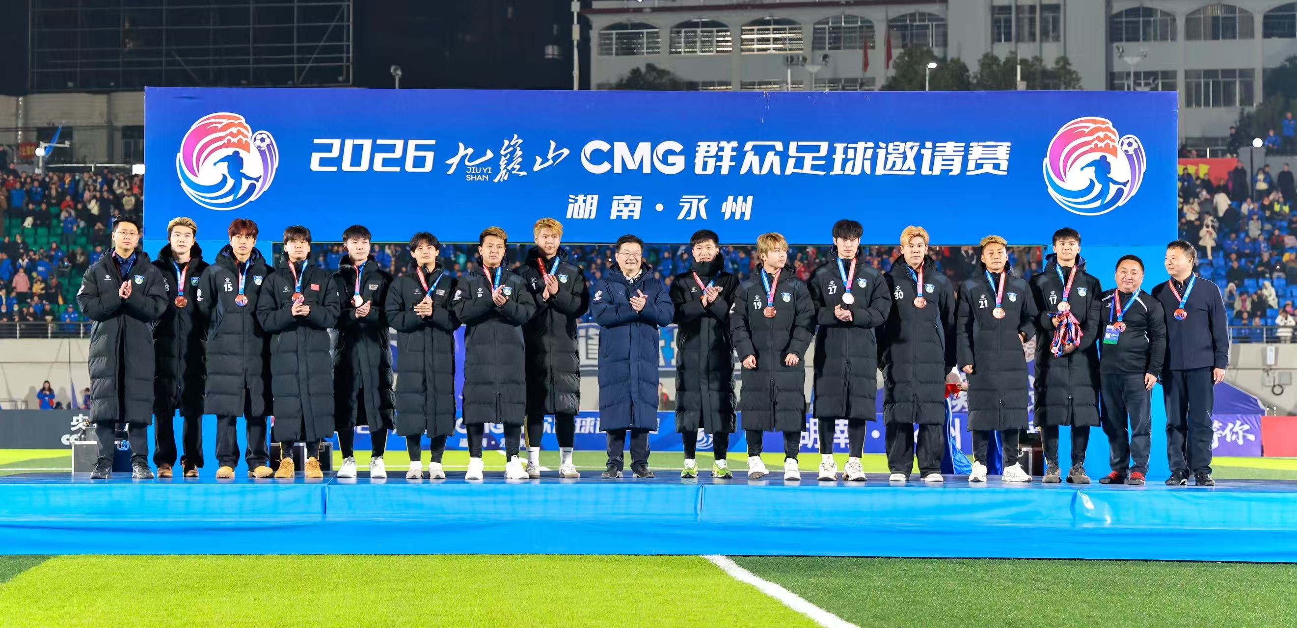 今日永州讯(全媒体记者 陈小波 袁志圣 文佳星)1月24日晚,2026九嶷山CMG群众足球邀请赛决赛在永州市体育场举行。经过90分钟的鏖战,最终广东湛江队以2∶1战胜湖南永州队,夺得CMG群众足球邀请赛冠军,湖南永州队获得亚军,山东泰安队获得季军。湖南省政协副主席、民盟省委会主委何寄华,中央广播电视总台体育青少节目中心党委书记吕逸涛,市委书记朱洪武,市委副书记、市长陈爱林,中央广播电视总台湖南总站站长朱兴建等观看比赛并颁奖。