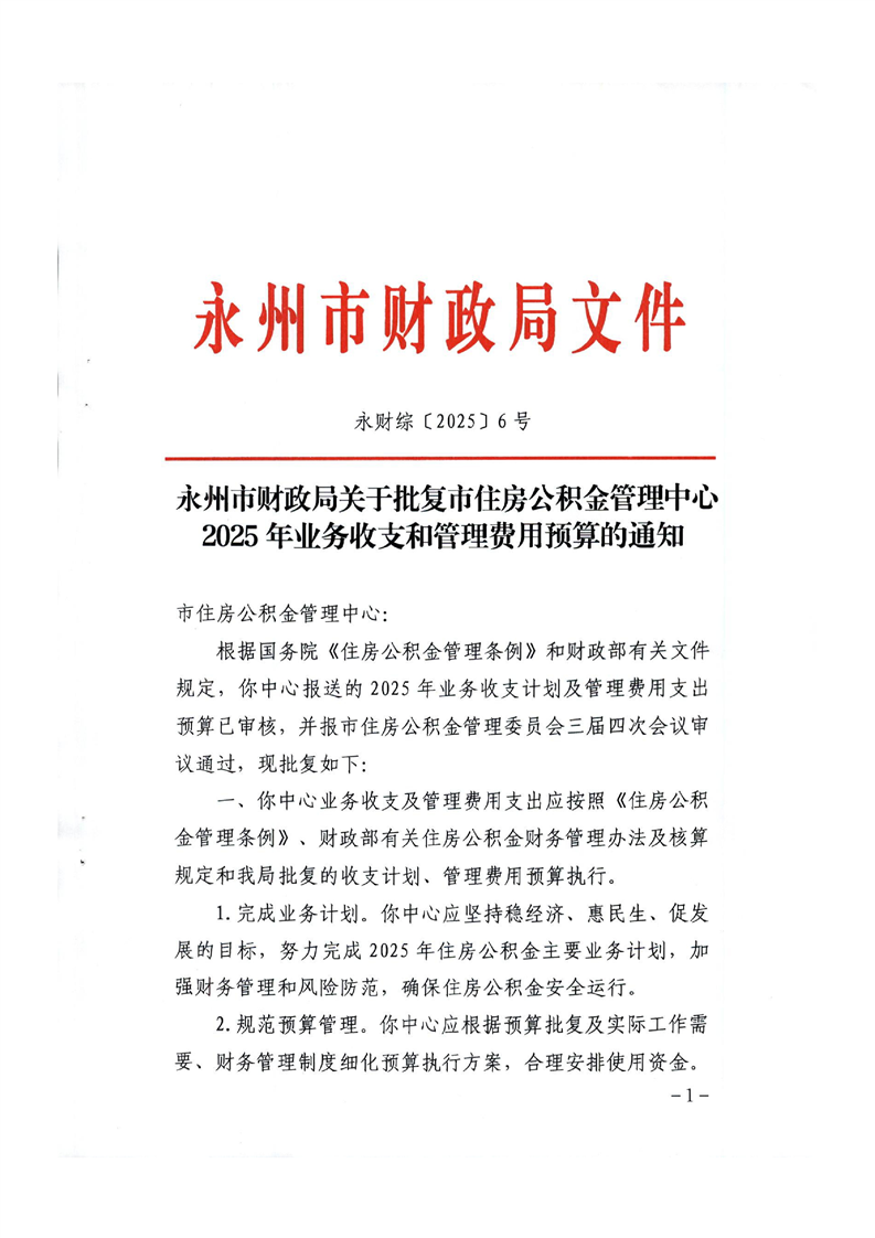永州市财政局关于批复市住房公积金管理中心2025年业务收支和管理费用预算的通知