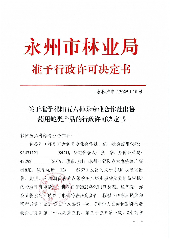永林护许【2025】10号关于准予祁阳五六种养专业合作社出售药用蛇类产品的行政许可决定书