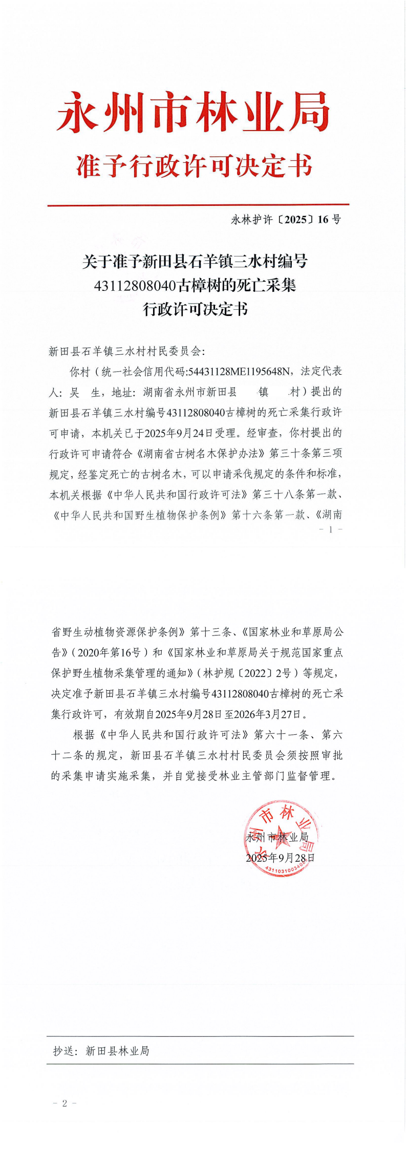 永林护许〔2025〕16号关于准予新田县石羊镇三水村编号43112808040古樟树的死亡采集行政许可决定书