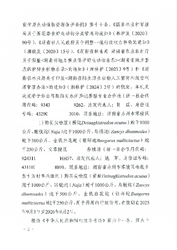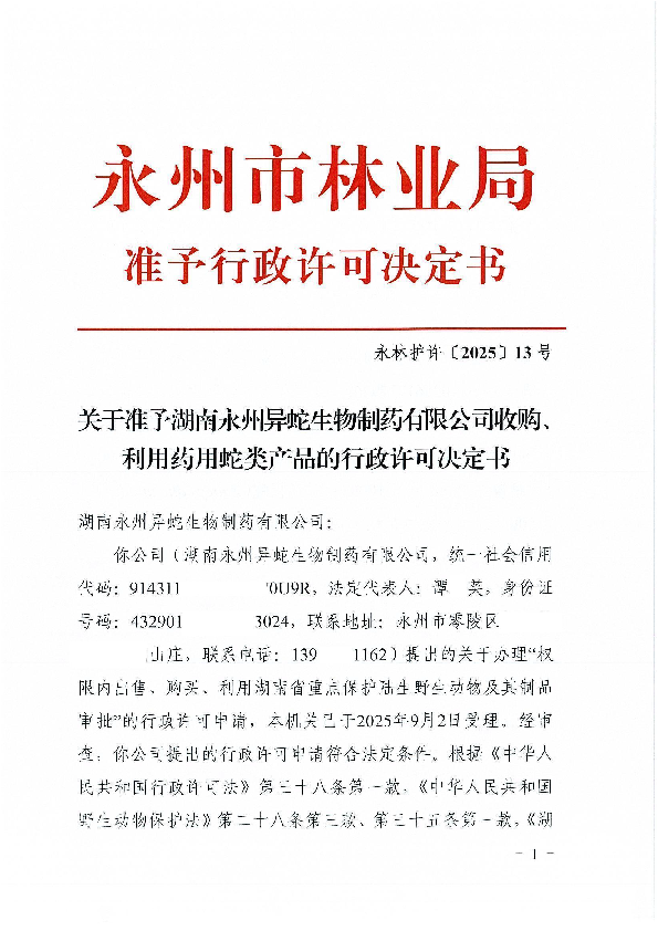 永林护许【2025】13号关于淮予湖南永州异蛇生物制药有限公司收购利用药用蛇类产品的行政许可决定书